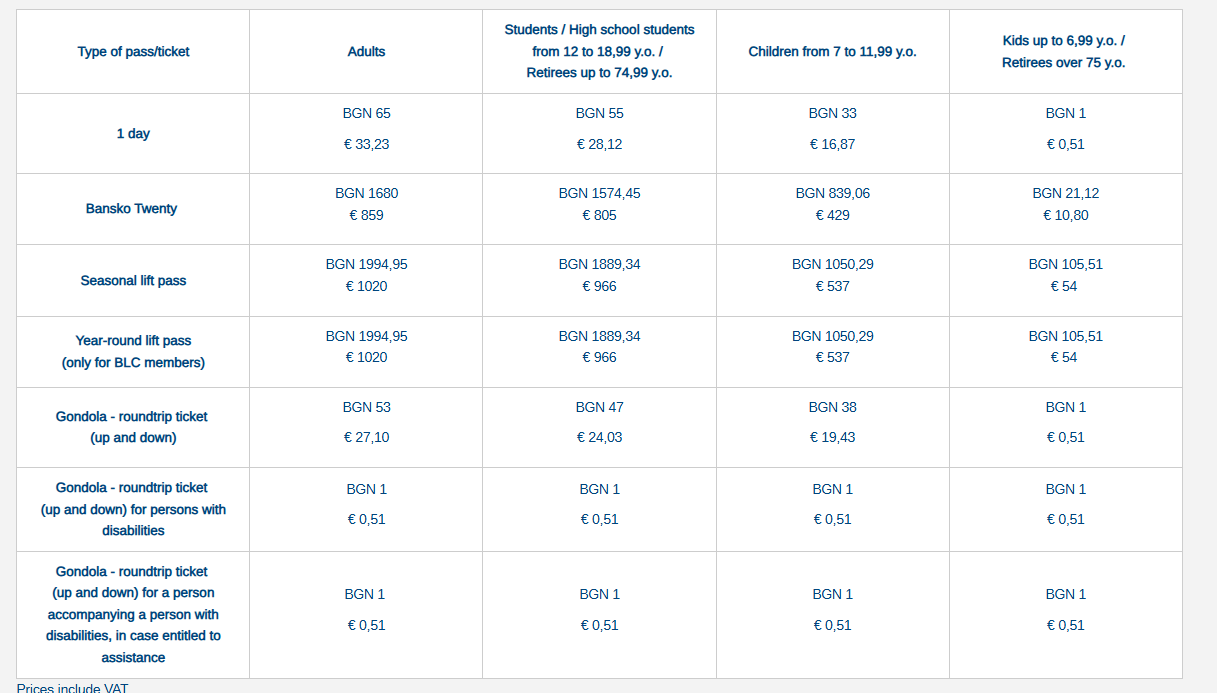 להלן תרגום טבלת מחירי כרטיסי הסקי (סקי-פס) בבנסקו, בולגריה, לשקלים בקירוב (מחירי יורו/לב בולגרי הם לפי הטבלה המקורית).